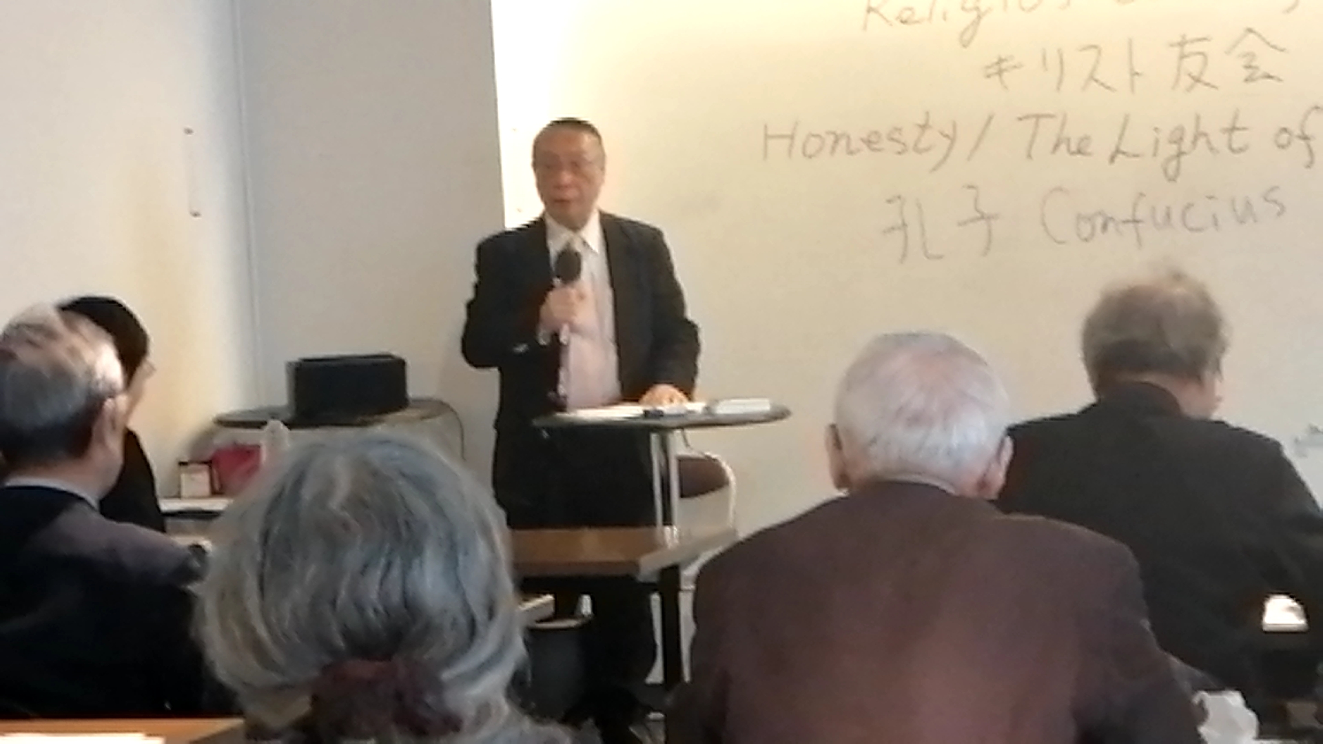 講演では、ジョージ・フォックスの思想をイエス、ソクラテス、孔子といった他の宗教家・哲学者と比較しながら、その特色が丁寧に語られました。